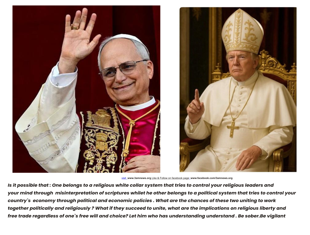 Many Roman Catholic Popes and American presidents have come and gone. There is great interest among many nations regarding the current global religious and political settings. Trump is affecting global economies with his policies while The Pope(PAPAL SYSTEM) is controlling churches and spiritual movements worldwide. Many are asking : “Is there going to be unity or conflict between Donald Trump and the New Pope. Unity towards what?”